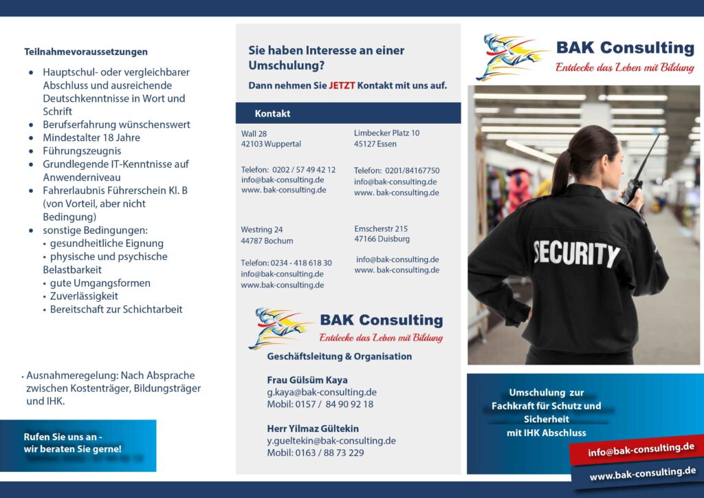 Fachkräfte für Schutz und Sicherheit unterstützen die öffentliche Sicherheit und Ordnung. Die Security-Experten sichern Personen, schützen Objekte, Werte und Anlagen durch präventive Maßnahmen und ggf. durch Gefahrenabwehr. Sie arbeiten im Objekt- und Anlagenschutz und finden weitere Einsatzgebiete bei verkehrs- und Veranstaltungsdiensten sowie im Werte- und Personenschutz im privaten und öffentlichen Bereich. Als Dienstleister sind sie kundenorientiert tätig auf der Grundlage von Rechtsvorschriften, technischen und organisatorischen Vorgaben, Regelwerken sowie spezifischen Arbeitsanweisungen. Sie überprüfen und überwachen die Einhaltung objektbezogener Schutz- und Sicherheitsvorschriften, inbesondere Arbeitsschutz, Brandhscutz, Umweltschutz und Datenschtz. Im Rahmen der Umschulung werden die für die Ausübung des Berufs benötigten Fertigkeiten und Kenntnisse handlungsorientiert vermittelt. Die Umschulung beinhaltet eine betriebliche Ausbildungsphase von mindestens 6 Monaten und endet mit einer Prüfung vor der Industrie- und Handelskammer (IHK).